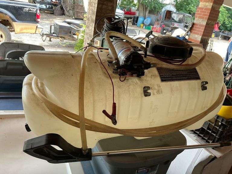 This auction features a 14-gallon spot sprayer. This sprayer is equipped with a pump and wand. The sprayer would be useful for applying herbicides, pesticides, and other liquids to lawns, gardens, and other outdoor areas.