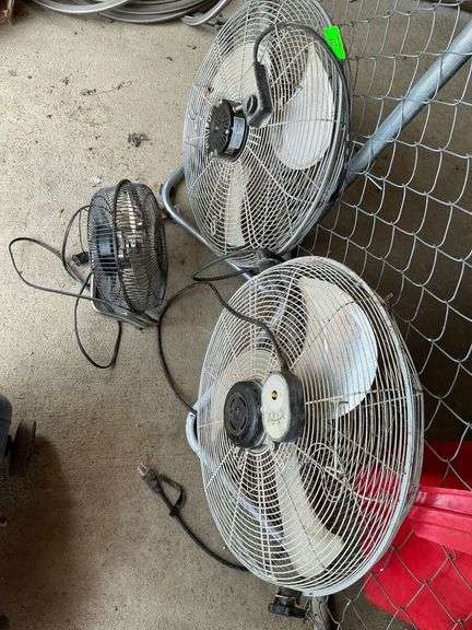 This lot contains three assorted shop fans, including two large metal-caged fans (one labeled "Maxx Air") and one smaller metal fan.