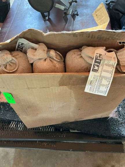 This auction includes a box of fly bullets insecticides. Each insecticide is contained within a fabric sack with a ring. The box includes instructions on how to use the insecticide mix.