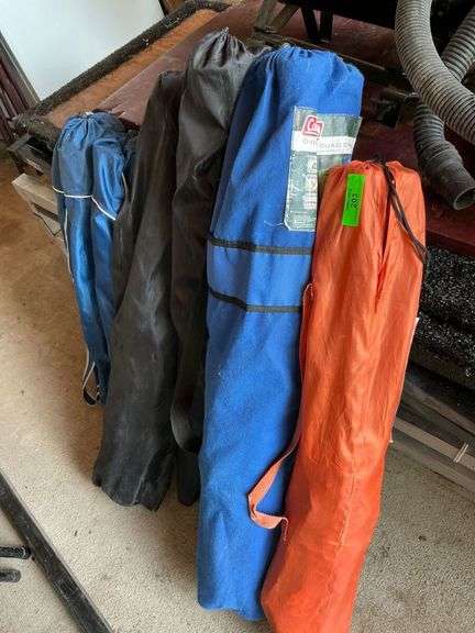 Group of folding chairs in various carrying bags. Includes Coleman Oversized Quad Chair and other brands. Assorted colors.