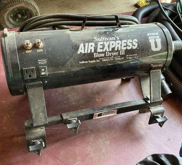 This lot includes two Sullivan's Air Express Blow Dryer III units, one in black and one in purple. Also included is a smaller 'Deluxe 401' blower unit, along with associated hoses and electrical cords. These items are often used for livestock grooming and showing purposes.