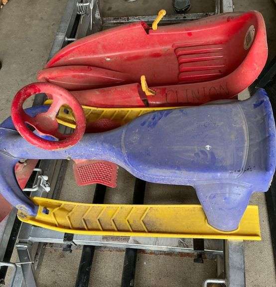 Get ready for winter fun with this lot of two children's sleds! Includes a red toboggan-style sled, and a steering wheel sled. Both are constructed from durable plastic. Great for snowy days and outdoor adventures.
