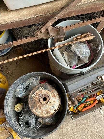 This lot includes various fencing tools and supplies. Included are wire stretchers, rolls of wire and barbed wire, post clips, a toolbox with pliers and other hand tools.