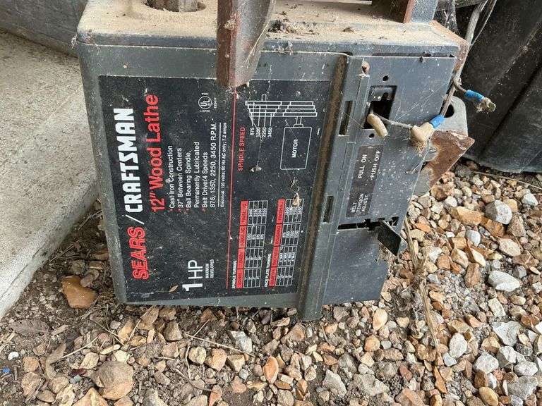 This listing features a Craftsman 12" Wood Lathe with a 1 HP motor. It includes a cast iron construction, ball bearing spindle, and a belt drive system. The lathe has multiple spindle speeds for various woodworking projects.