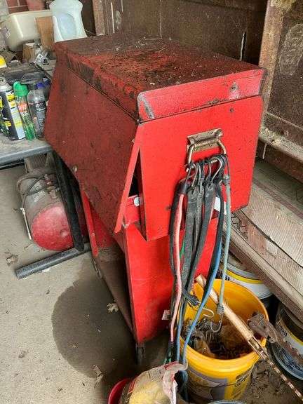 Rolling tool chest with a top compartment and two drawers. Features a handle and wheels for portability. Also includes various straps and hoses.