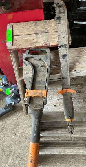 This lot features two Fiskars tools designed for clearing brush and vegetation. Included is a machete with a saw blade edge, along with a brush axe. Both tools have orange and black handles.