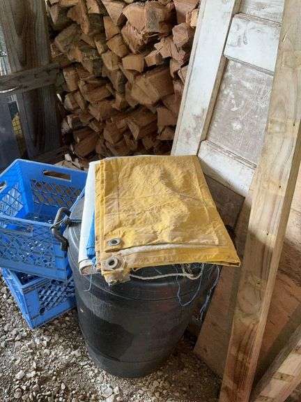 LOT 667 - Foam panel, wooden door, tarps, plastic crates