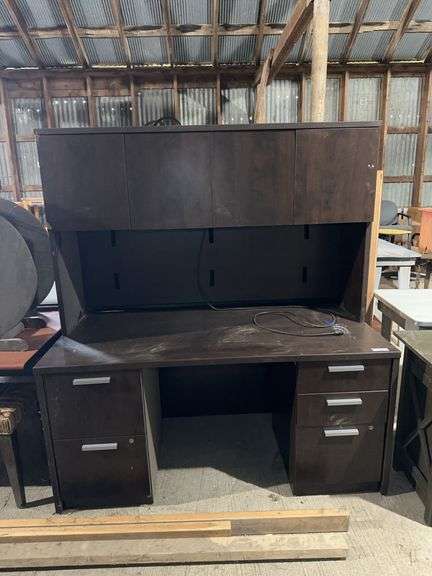 This is a dark wood office desk with a hutch on top and several drawers for storage. The desk appears to be in one solid piece with light unit. Item dimensions are 66x60x29.