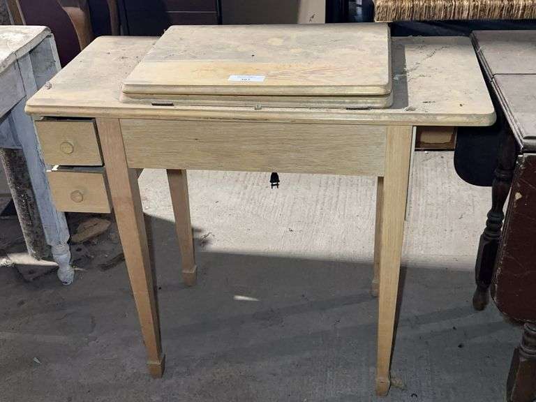 Color Magic II by Alco sewing machine with a wooden sewing machine cabinet. The cabinet measures approximately 31 x 35 x 16 inches and has two drawers. The sewing machine is in the cabinet.