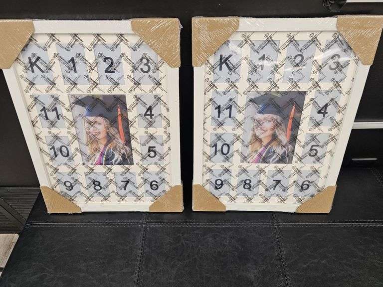 (2 qty) 12 1/2 x 17 inch white, wooden photo frames with display panels for Kindergarten through Senior year pictures. Retail Value: $40