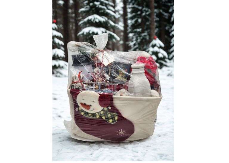 This 15x11 inch, soft-sided white fabric tote is filled with Snowman themed decor! Snowman cup with cookies, Christmas stocking and small pillow, cannister, sliver snowman plate, notepad, milk bottle, door hanger, plant stake, chalkboard, and snowman bath bomb (in a bag). Retail Value: $75
