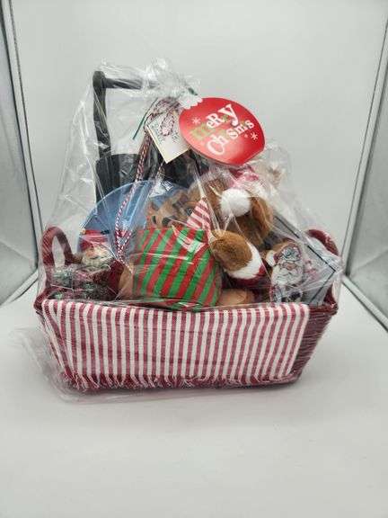 This 16x9 inch red wicker basket is filled with: a red and white table runner, a Santa cookie plate, a green wooden sleigh, a ceramic Santa figurine, a plush Christmas bear with miniature toys, two small Santa signs and a "Tis the Season to be Jolly" chalkboard sign. Retail Value: $75
