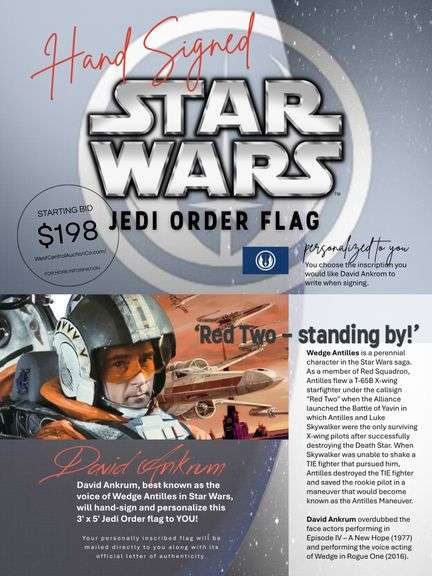 A rare treasure for any Star Wars fan! David Ankrum—the iconic voice behind Rebel pilot Wedge Antilles—will hand-sign and personalize this 3’x5’ Jedi Order flag just for you. Your one-of-a-kind collectible will arrive with a letter of authenticity, making it a true galactic keepsake. Choose your own personalization and bring a piece of the Star Wars universe home—directly from the man who helped give voice to the Rebellion! Retail Value: $350