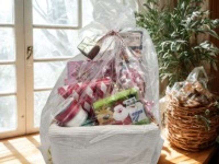 This 12x8 inch wicker basket is filled with: a package of 3 rolls of premium wrapping paper, package of sheets of wrapping paper, Christmas bags, roll of Christmas ribbon and pink bow, and a pack of 3 small Christmas boxes. Retail Value:$30