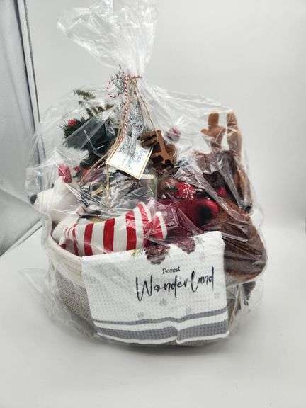 This 14x10 inch soft-sided grey with white basket includes the following: white with grey winter dish towel, a plush brown reindeer, a red and white reindeer plant holder, reindeer ornaments, reindeel photo holder, a red mug, an evergreen reindeer, plus a wooden reindeer shelf ornament! Retail Value: $60