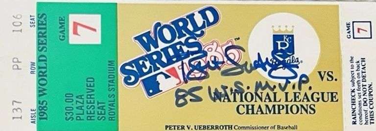 Step back into Kansas City baseball history with this 1985 World Series commemorative ticket, personally signed by Royals pitching legend Bret Saberhagen. That unforgettable season saw Saberhagen lead the team to glory — earning World Series MVP honors and sealing his place as one of the greats in Royals history. Beautifully presented and authenticated, this signed keepsake captures the spirit of the Royals’ first championship victory — a moment that united a city and defined an era of Kansas City pride. A timeless addition for any Royals fan or sports memorabilia collector — celebrating the golden year when determination, teamwork, and a young pitcher made baseball history. Retail Value: $300