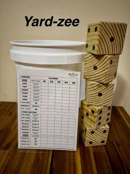 Yard Yahtzee game comes with giant dice, storage bucket and reusable Scoreboard. Retail Value: $40