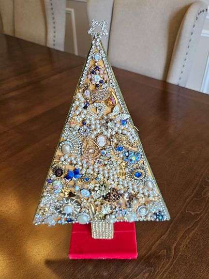 Beautiful handcrafted Christmas Tree, decorated in antique jewelry. 15" x 9" with a red velvet base and green velvet back Retail Value: $40