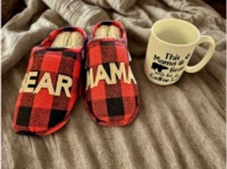 "This Mama Bear" coffee cup and Dearfoam, women's plaid mule slippers; size 9-10. Retail Value: $37
