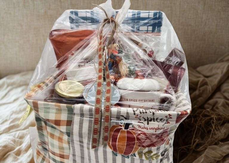 Included: a fall dish towel, placemats and napkins, pumpkin cutting board and woven mat, pumpkin kettle corn, fall pasta, salted apple caramel sauce, a pumpkin cup with lid, fall ornaments, a 'Thankful' container, a small scarecrow, a fall spatula. Retail Value: $70