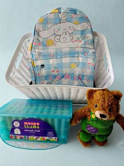 This package includes a Cinnamoroll brand, soft blue, white, yellow, pink and green, soft-sided back pack that can be used as a diaper bag; a 10 inch, soft, "Corduroy" bear; and a 50 piece tub of sidewalk chalk for hours of fun! Retail Value: $48